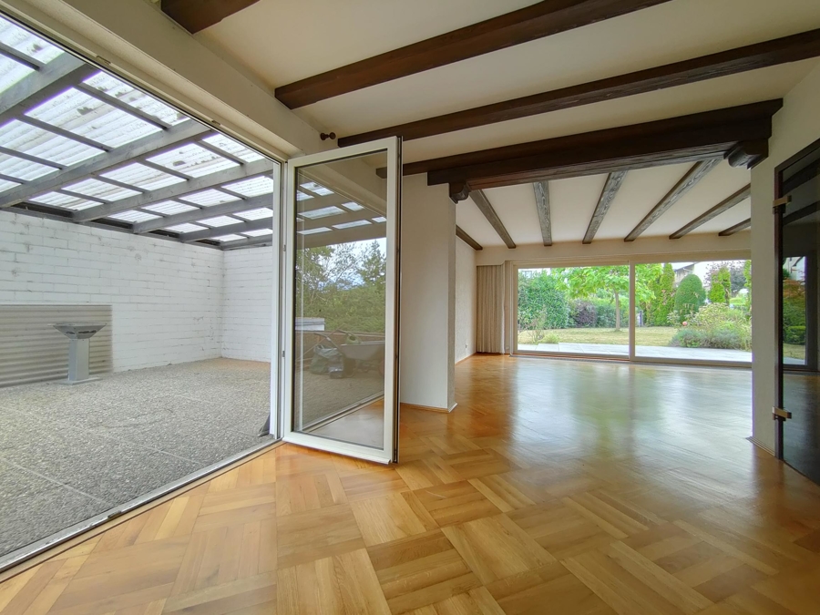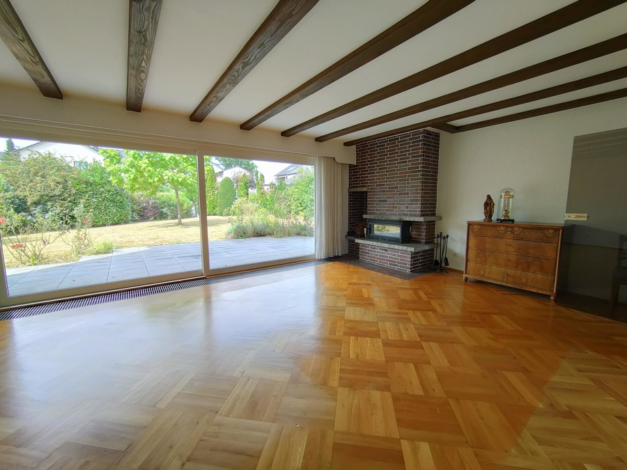 Großzügiger, heller Wohnbereich mit Kamin, Glas-Schiebetüren und direktem Zugang zur Terrasse und in dem großzügigen Garten. Ein offen gestalteter Essbereich mit Zugang zur überdachten und geschützten seitlichen Terrasse, 1 separate Küche, 1 Zimmer mit eigenem Terrassenzugang – ideal als Büro, Gästezimmer oder weiteres Schlafzimmer, 1 Gäste-WC und eine Abstellkammer.