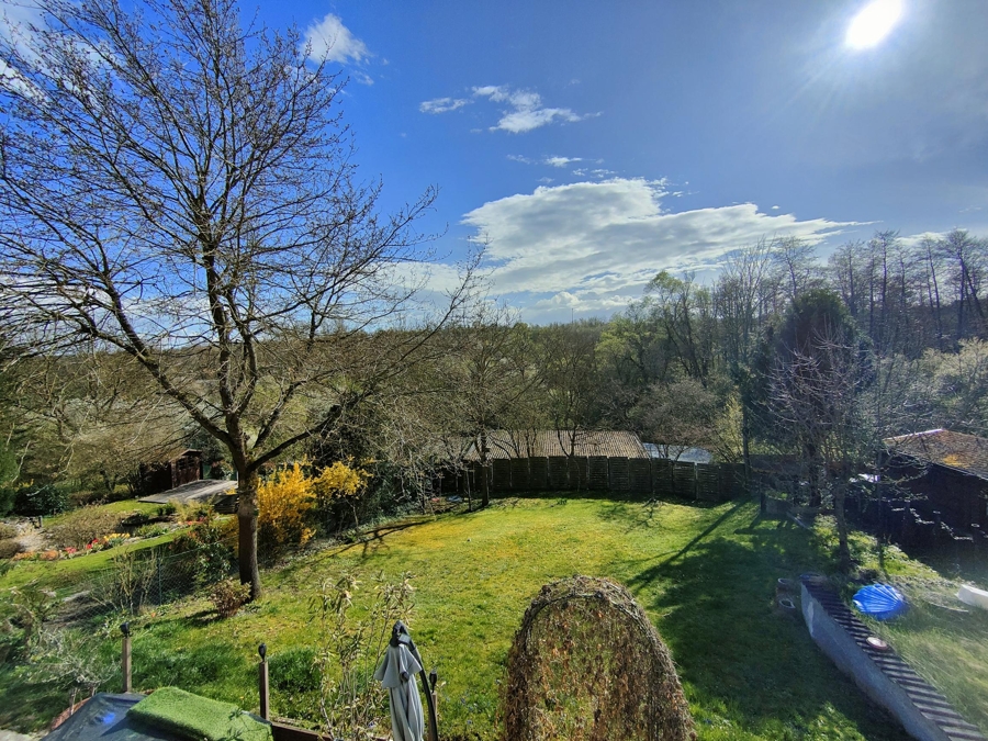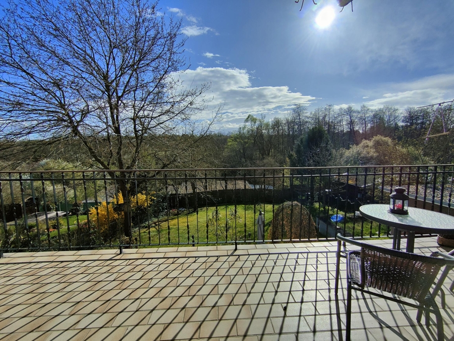 Das Erdgeschoss bietet, auf ca. 90 m² Wohnfläche, ein großzügiges Wohnzimmer, zwei Schlafzimmer, eine Küche mit direktem Zugang zu einem großen Balkon, ein Tageslichtbad sowie einen Flur mit Kellerzugang. Der Balkon ist sowohl von der Küche als auch vom Wohnzimmer begehbar und eröffnet einen schönen Blick in den Garten und die umliegende Landschaft – ein idealer Ort für entspannte Stunden im Freien.