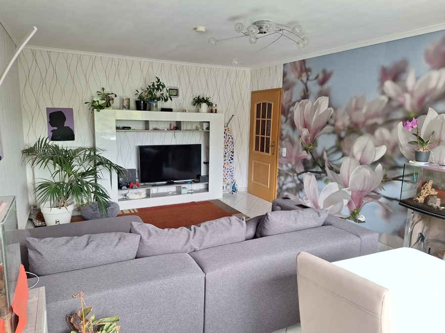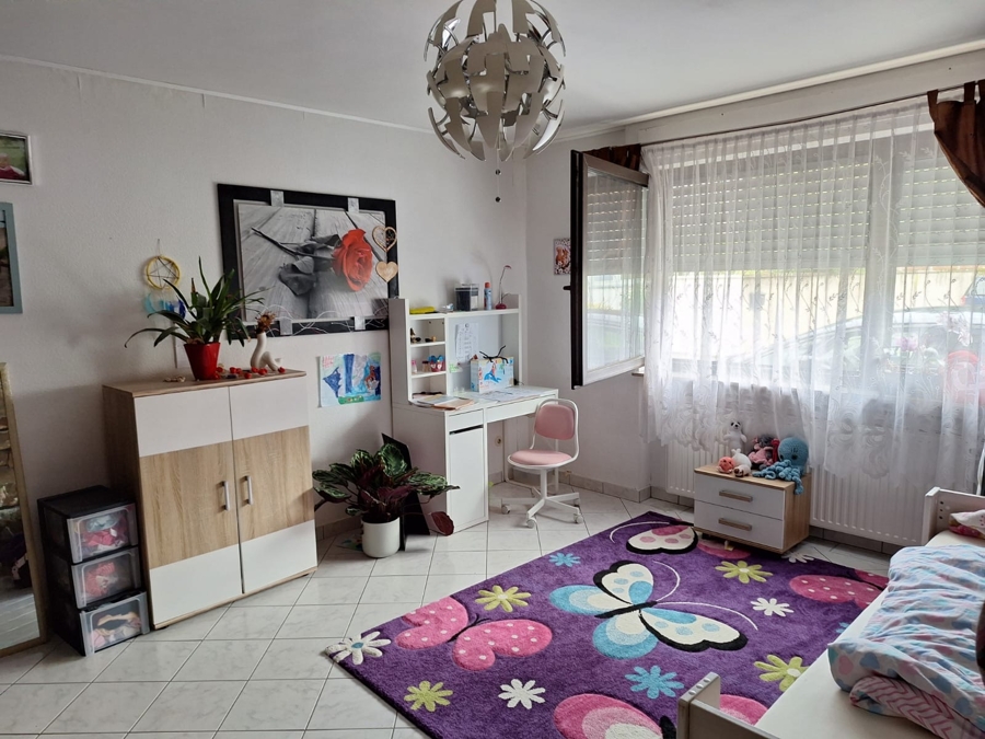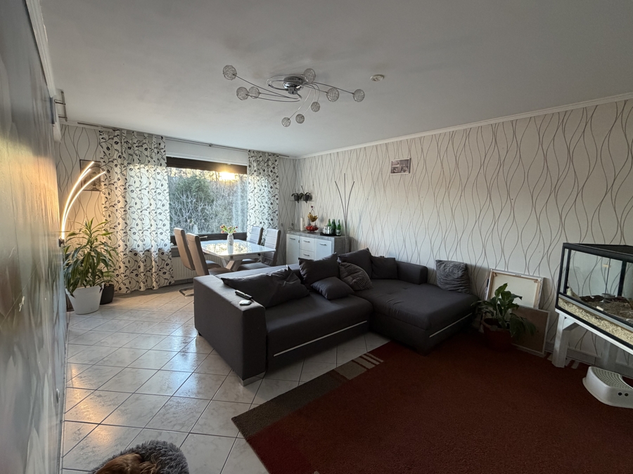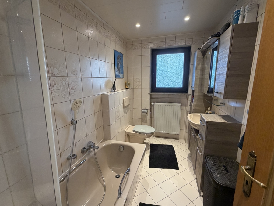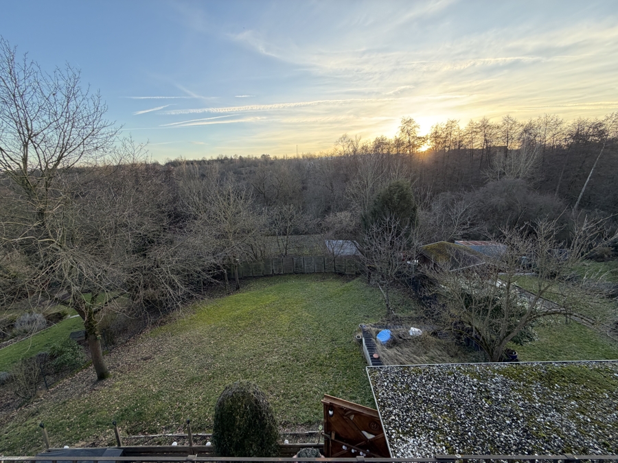 Das Erdgeschoss bietet auf ca. 90 m² Wohnfläche ein großzügiges Wohnzimmer, zwei Schlafzimmer, eine Küche mit direktem Zugang zu einem großen Balkon, ein Tageslichtbad sowie einen Flur mit Kellerzugang. Der Balkon ist sowohl von der Küche als auch vom Wohnzimmer begehbar und eröffnet einen schönen Blick in den Garten und die umliegende Landschaft – ein idealer Ort für entspannte Stunden im Freien.